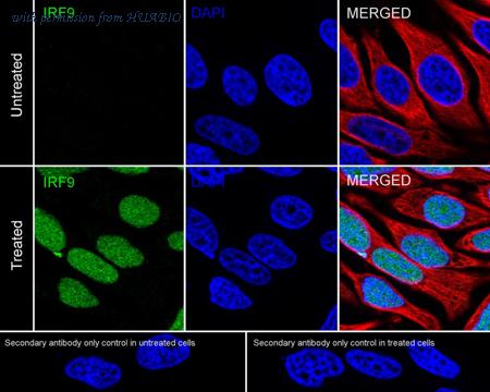 Immunocytochemistry analysis of HeLa cells treated with 10ng/mL IFN-α1 for 16 hours labeling IRF9 with Rabbit anti-IRF9 antibody (HA751211) at 1/100 dilution. Cells were fixed in 4% paraformaldehyde for 15 minutes at room temperature, permeabilized with 0.1% Triton X-100 in PBS for 15 minutes at room temperature, then blocked with 1% BSA in 10% negative goat serum for 1 hour at room temperature. Cells were then incubated with Rabbit anti-IRF9 antibody (HA751211) at 1/100 dilution in 1% BSA in PBST overnight at 4 ℃. Goat Anti-Rabbit IgG H&L (iFluor™ 488, HA1121) was used as the secondary antibody at 1/1,000 dilution. PBS instead of the primary antibody was used as the secondary antibody only control. Nuclear DNA was labelled in blue with DAPI. Beta tubulin (HA601187, red) was stained at 1/100 dilution overnight at +4℃. Goat Anti-Mouse IgG H&L (iFluor™ 594, HA1126) was used as the secondary antibody at 1/1,000 dilution.