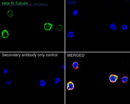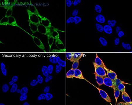 Immunocytochemistry analysis of Neuro-2a cells labeling Beta III Tubulin with Rabbit anti-Beta III Tubulin antibody (ET1604-17) at 1/200 dilution. Cells were fixed in 4% paraformaldehyde for 20 minutes at room temperature, permeabilized with 0.1% Triton X-100 in PBS for 5 minutes at room temperature, then blocked with 1% BSA in 10% negative goat serum for 1 hour at room temperature. Cells were then incubated with Rabbit anti-Beta III Tubulin antibody (ET1604-17) at 1/200 dilution in 1% BSA in PBST overnight at 4 ℃. Goat Anti-Rabbit IgG H&L (iFluor™ 488, HA1121) was used as the secondary antibody at 1/1,000 dilution. PBS instead of the primary antibody was used as the secondary antibody only control. Nuclear DNA was labelled in blue with DAPI.