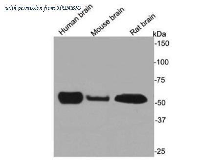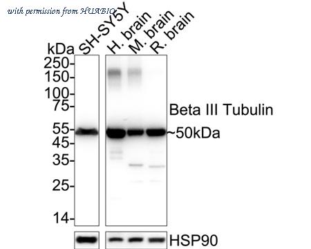 Western blot analysis of Beta III Tubulin on different lysates with Rabbit anti-Beta III Tubulin antibody (0807-2) at 1/2,000 dilution. Lane 1: SH-SY5Y cell lysate (20 µg/Lane) Lane 2: Human brain tissue lysate (40 µg/Lane) Lane 3: Mouse brain tissue lysate (40 µg/Lane) Lane 4: Rat brain tissue lysate (40 µg/Lane) Predicted band size: 50 kDa Observed band size: 50 kDa Exposure time: 2 seconds; ECL: K1801; 4-20% SDS-PAGE gel. Proteins were transferred to a PVDF membrane and blocked with 5% NFDM/TBST for 1 hour at room temperature. The primary antibody (0807-2) at 1/2,000 dilution was used in 5% NFDM/TBST at 4℃ overnight. Goat Anti-Rabbit IgG - HRP Secondary Antibody (HA1001) at 1/50,000 dilution was used for 1 hour at room temperature.