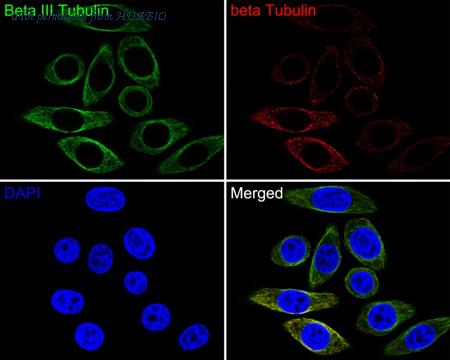 Immunocytochemistry analysis of HepG2 cells labeling Beta III Tubulin with Mouse anti-Beta III Tubulin antibody (HA600106F) at 1/50 dilution. Cells were fixed in 4% paraformaldehyde for 30 minutes, permeabilized with 0.05% Triton X-100 in PBS for 20 minutes, and then blocked with 2% negative goat serum for 30 minutes at room temperature. Cells were then incubated with Mouse anti-Beta III Tubulin antibody (HA600106F, iFluor™ 488) at 1/50 dilution in 2% negative goat serum overnight at 4 ℃. Nuclear DNA was labelled in blue with DAPI. beta Tubulin (ET1602-4, red) was stained at 1/100 dilution overnight at +4℃. Goat Anti-Rabbit IgG H&L (iFluor™ 647, HA1123) were used as the secondary antibody at 1/1,000 dilution.