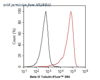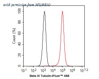 Flow cytometric analysis of SH-SY5Y cells labeling Beta III Tubulin. Cells were fixed and permeabilized. Then incubated for 1 hour at +4℃ with Beta III Tubulin (HA600106F, red, 1ug/ml). Unlabelled sample was used as a control (cells without incubation with primary antibody; black).