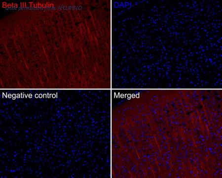 Immunocytochemistry analysis of SH-SY5Y cells labeling Beta III Tubulin with Mouse anti-Beta III Tubulin antibody (M0805-8) at 1/500 dilution. Cells were fixed in 4% paraformaldehyde for 20 minutes at room temperature, permeabilized with 0.1% Triton X-100 in PBS for 5 minutes at room temperature, then blocked with 1% BSA in 10% negative goat serum for 1 hour at room temperature. Cells were then incubated with Mouse anti-Beta III Tubulin antibody (M0805-8) at 1/500 dilution in 1% BSA in PBST overnight at 4 ℃. Goat Anti-Mouse IgG H&L (iFluor™ 488, HA1125) was used as the secondary antibody at 1/1,000 dilution. PBS instead of the primary antibody was used as the secondary antibody only control. Nuclear DNA was labelled in blue with DAPI. beta Tubulin (ET1602-4, red) was stained at 1/100 dilution overnight at +4℃. Goat Anti-Rabbit IgG H&L (iFluor™ 594, HA1122) were used as the secondary antibody at 1/1,000 dilution.