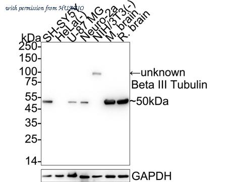 Western blot analysis of Beta III Tubulin on different lysates with Rabbit anti-Beta III Tubulin antibody (0805-3) at 1/5,000 dilution. Lane 1: SH-SY5Y cell lysate (20 µg/Lane) Lane 2: NIH/3T3 cell lysate (20 µg/Lane) Lane 3: PC-12 cell lysate (20 µg/Lane) Lane 4: Human brain tissue lysate (40 µg/Lane) Lane 5: Mouse brain tissue lysate (40 µg/Lane) Lane 6: Rat brain tissue lysate (40 µg/Lane) Predicted band size: 50 kDa Observed band size: 50 kDa Exposure time: 10 seconds; ECL: K1801; 4-20% SDS-PAGE gel. Proteins were transferred to a PVDF membrane and blocked with 5% NFDM/TBST for 1 hour at room temperature. The primary antibody (0805-3) at 1/5,000 dilution was used in 5% NFDM/TBST at 4℃ overnight. Goat Anti-Rabbit IgG - HRP Secondary Antibody (HA1001) at 1/50,000 dilution was used for 1 hour at room temperature.