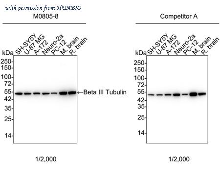 Western blot analysis of Beta III Tubulin on different lysates with Mouse anti-Beta III Tubulin antibody (M0805-8) at 1/2,000 dilution and competitor's antibody at 1/2,000 dilution. Lane 1: SH-SY5Y cell lysate Lane 2: U-87 MG cell lysate Lane 3: A-172 cell lysate Lane 4: Neuro-2a cell lysate Lane 5: PC-12 cell lysate Lane 6: Mouse brain tissue lysate Lane 7: Rat brain tissue lysate Lysates/proteins at 10 µg/Lane. Predicted band size: 50 kDa Observed band size: 50 kDa Exposure time: 11 seconds; ECL: K1801; 4-20% SDS-PAGE gel. Proteins were transferred to a PVDF membrane and blocked with 5% NFDM/TBST for 1 hour at room temperature. The primary antibody (M0805-8) at 1/2,000 dilution and competitor's antibody at 1/2,000 dilution were used in 5% BSA at 4℃ overnight. Goat Anti-Mouse IgG - HRP Secondary Antibody (HA1006) at 1/50,000 dilution was used for 1 hour at room temperature.