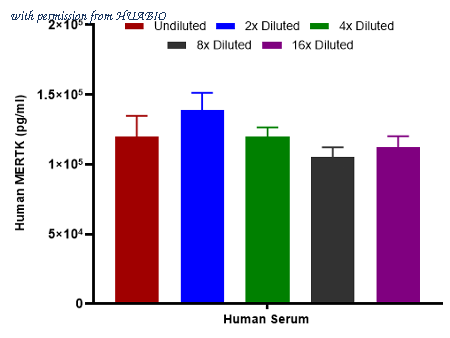 Interpolated concentrations of native MERTK in human samples. Capture: HA723479, Human MERTK Rabbit mAb [PSH12-69] Detector: HA723480, Human MERTK Rabbit mAb [PSH12-70] Interpolated concentration of native MERTK was measured in duplicate at different sample concentrations. Undiluted samples were 10% cell supernatant. The interpolated dilution factor corrected values were plotted (mean +/- SD, n=2). The mean MERTK concentration was determined to be 119,371 pg/mL in human serum.