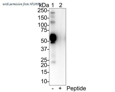 Western blot analysis of OLFM4 on different lysates with Rabbit anti-OLFM4 antibody (HA750714) at 1/1,000 dilution. Lane 1: OLFM4 recombinant protein Lane 2: OLFM4 recombinant protein with immunising peptide Lysates/proteins at 50 ng/Lane. Exposure time: 43 seconds; 4-20% SDS-PAGE gel. Proteins were transferred to a PVDF membrane and blocked with 5% NFDM/TBST for 1 hour at room temperature. The primary antibody (HA750714) at 1/1,000 dilution was used in 5% NFDM/TBST at room temperature for 2 hours. Goat Anti-Rabbit IgG - HRP Secondary Antibody (HA1001) at 1/100,000 dilution was used for 1 hour at room temperature.