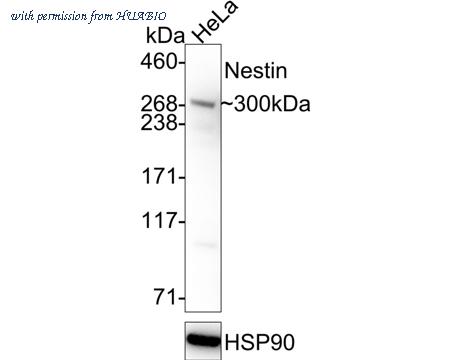 Western blot analysis of Nestin on HeLa cell lysates with Rabbit anti-Nestin antibody (ET1611-21) at 1/1,000 dilution. Lysates/proteins at 20 µg/Lane. Predicted band size: 177 kDa Observed band size: 300 kDa Exposure time: 2 seconds; ECL: K1801; 3-8% SDS-PAGE gel. Proteins were transferred to a PVDF membrane and blocked with 5% NFDM/TBST for 1 hour at room temperature. The primary antibody (ET1611-21) at 1/1,000 dilution was used in 5% NFDM/TBST at 4℃ overnight. Goat Anti-Rabbit IgG - HRP Secondary Antibody (HA1001) at 1/50,000 dilution was used for 1 hour at room temperature.