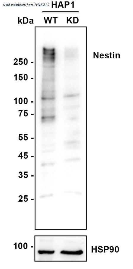 Western blot analysis of Nestin on different lysates with Rabbit anti-Nestin antibody (ET1611-21) at 1/1,000 dilution. Lane 1: HAP1-parental cell lysate Lane 2: HAP1-Nestin KD cell lysate Lysates/proteins at 10 µg/Lane. Predicted band size: 177 kDa Observed band size: 300 kDa Exposure time: 20 seconds; ECL: K1801; 4-20% SDS-PAGE gel. Proteins were transferred to a PVDF membrane and blocked with 5% NFDM/TBST for 1 hour at room temperature. The primary antibody (ET1611-21) at 1/1,000 dilution was used in primary antibody dilution (K1803) at 4℃ overnight. Goat Anti-Rabbit IgG - HRP Secondary Antibody (HA1001) at 1/50,000 dilution was used for 1 hour at room temperature.