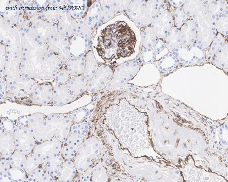 Application: IHC-Fr Species: Rat Site: Kindey Sample: Frozen section Antibody concentration: 1/500 Antigen retrieval: Not required