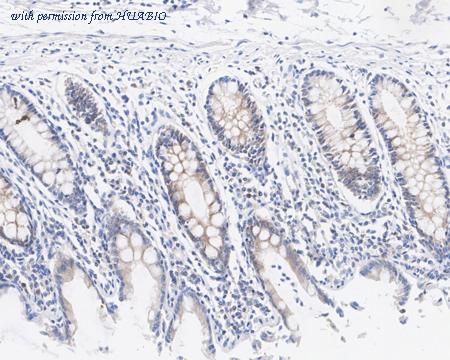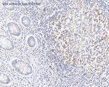 Immunohistochemical analysis of paraffin-embedded human colon tissue with Rabbit anti-MALT1 antibody (HA750722) at 1/2,000 dilution. The section was pre-treated using heat mediated antigen retrieval with sodium citrate buffer (pH 6.0) (high pressure) for 2 minutes. The tissues were blocked in 1% BSA for 20 minutes at room temperature, washed with ddH2O and PBS, and then probed with the primary antibody (HA750722) at 1/2,000 dilution for 1 hour at room temperature. The detection was performed using an HRP conjugated compact polymer system. DAB was used as the chromogen. Tissues were counterstained with hematoxylin and mounted with DPX.