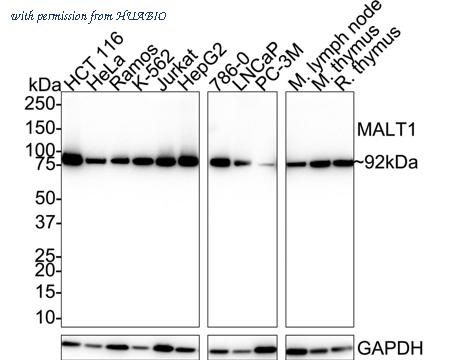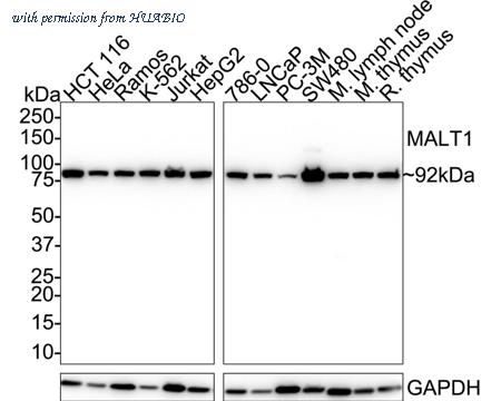 Western blot analysis of MALT1 on different lysates with Rabbit anti-MALT1 antibody (HA721244) at 1/1,000 dilution. Lane 1: HCT 116 cell lysate (20 µg/Lane) Lane 2: HeLa cell lysate (20 µg/Lane) Lane 3: Ramos cell lysate (20 µg/Lane) Lane 4: K-562 cell lysate (20 µg/Lane) Lane 5: Jurkat cell lysate (20 µg/Lane) Lane 6: HepG2 cell lysate (20 µg/Lane) Lane 7: 786-0 cell lysate (20 µg/Lane) Lane 8: LNCaP cell lysate (20 µg/Lane) Lane 9: PC-3M cell lysate (20 µg/Lane) Lane 10: Mouse lymph node tissue lysate (no heat) (40 µg/Lane) Lane 11: Mouse thymus tissue lysate (40 µg/Lane) Lane 12: Rat thymus tissue lysate (40 µg/Lane) Notice: no heat means the lysate is not boiled. Predicted band size: 92 kDa Observed band size: 92 kDa Exposure time: 37 seconds; ECL: K1802; 4-20% SDS-PAGE gel. Proteins were transferred to a PVDF membrane and blocked with 5% NFDM/TBST for 1 hour at room temperature. The primary antibody (HA721244) at 1/1,000 dilution was used in 5% NFDM/TBST at 4℃ overnight. Goat Anti-Rabbit IgG - HRP Secondary Antibody (HA1001) at 1/50,000 dilution was used for 1 hour at room temperature.