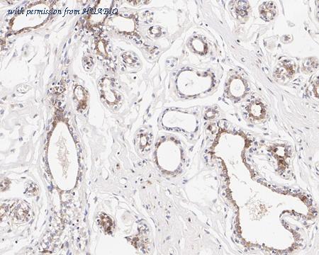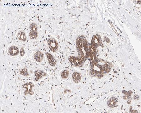 Immunohistochemical analysis of paraffin-embedded human breast tissue with Rabbit anti-TMP21 antibody (HA750719) at 1/200 dilution. The section was pre-treated using heat mediated antigen retrieval with Tris-EDTA buffer (pH 9.0) for 20 minutes. The tissues were blocked in 1% BSA for 20 minutes at room temperature, washed with ddH2O and PBS, and then probed with the primary antibody (HA750719) at 1/200 dilution for 1 hour at room temperature. The detection was performed using an HRP conjugated compact polymer system. DAB was used as the chromogen. Tissues were counterstained with hematoxylin and mounted with DPX.
