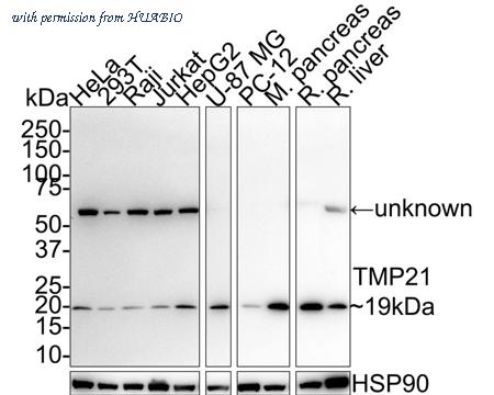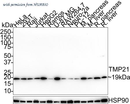Western blot analysis of TMP21 on different lysates with Rabbit anti-TMP21 antibody (HA721679) at 1/5,000 dilution. Lane 1: HeLa cell lysate (20 µg/Lane) Lane 2: 293T cell lysate (20 µg/Lane) Lane 3: Raji cell lysate (20 µg/Lane) Lane 4: Jurkat cell lysate (20 µg/Lane) Lane 5: HepG2 cell lysate (20 µg/Lane) Lane 6: U-87 MG cell lysate (20 µg/Lane) Lane 7: PC-12 cell lysate (20 µg/Lane) Lane 8: Mouse pancreas tissue lysate (40 µg/Lane) Lane 9: Rat pancreas tissue lysate (40 µg/Lane) Lane 10: Rat liver tissue lysate (40 µg/Lane) Predicted band size: 25 kDa Observed band size: 19 kDa Exposure time: 5 minutes 10 seconds; 4-20% SDS-PAGE gel. Proteins were transferred to a PVDF membrane and blocked with 5% NFDM/TBST for 1 hour at room temperature. The primary antibody (HA721679) at 1/5,000 dilution was used in 5% NFDM/TBST at room temperature for 2 hours. Goat Anti-Rabbit IgG - HRP Secondary Antibody (HA1001) at 1/50,000 dilution was used for 1 hour at room temperature.