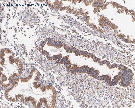 Immunohistochemical analysis of paraffin-embedded human breast tissue with Rabbit anti-TMP21 antibody (HA721679) at 1/200 dilution. The section was pre-treated using heat mediated antigen retrieval with Tris-EDTA buffer (pH 9.0) for 20 minutes. The tissues were blocked in 1% BSA for 20 minutes at room temperature, washed with ddH2O and PBS, and then probed with the primary antibody (HA721679) at 1/200 dilution for 1 hour at room temperature. The detection was performed using an HRP conjugated compact polymer system. DAB was used as the chromogen. Tissues were counterstained with hematoxylin and mounted with DPX.