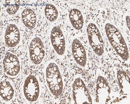 Immunohistochemical analysis of paraffin-embedded human colon tissue with Rabbit anti-TMP21 antibody (HA750719) at 1/200 dilution. The section was pre-treated using heat mediated antigen retrieval with Tris-EDTA buffer (pH 9.0) for 20 minutes. The tissues were blocked in 1% BSA for 20 minutes at room temperature, washed with ddH2O and PBS, and then probed with the primary antibody (HA750719) at 1/200 dilution for 1 hour at room temperature. The detection was performed using an HRP conjugated compact polymer system. DAB was used as the chromogen. Tissues were counterstained with hematoxylin and mounted with DPX.