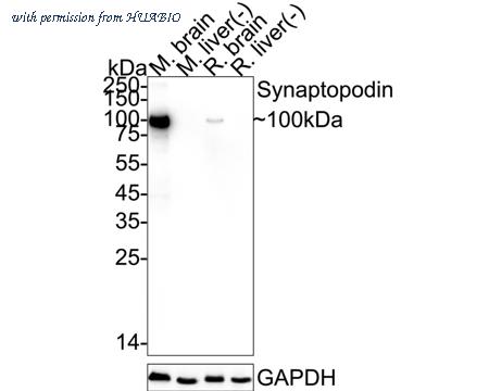 Western blot analysis of Synaptopodin on different lysates with Rabbit anti-Synaptopodin antibody (HA723211) at 1/2,000 dilution. Lane 1: Mouse brain tissue lysate Lane 2: Mouse liver tissue lysate (negative) Lane 3: Rat brain tissue lysate Lane 4: Rat liver tissue lysate (negative) Lysates/proteins at 20 µg/Lane. Predicted band size: 100 kDa Observed band size: 100 kDa Exposure time: 25 seconds; ECL: K1801; 4-20% SDS-PAGE gel. Proteins were transferred to a PVDF membrane and blocked with 5% NFDM/TBST for 1 hour at room temperature. The primary antibody (HA723211) at 1/2,000 dilution was used in 5% NFDM/TBST at 4℃ overnight. Goat Anti-Rabbit IgG - HRP Secondary Antibody (HA1001) at 1/50,000 dilution was used for 1 hour at room temperature.