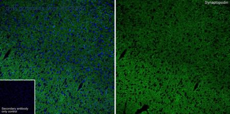 Immunofluorescence analysis of frozen mouse brain tissue with Rat anti-Synaptopodin antibody (HA601402) at 1/500 dilution. The section was pre-treated using 1% SDS buffer (in PBS, pH 7.4) for 5 minutes at room temperature. The tissues were blocked in 10% negative goat serum for 1 hour at room temperature, washed with PBS, and then probed with the primary antibody (HA601402, green) at 1/500 dilution overnight at 4 ℃, washed with PBS. Goat Anti-Rat IgG H&L (iFluor™ 488, HA1133) was used as the secondary antibody at 1/1,000 dilution. Nuclei were counterstained with DAPI (blue).