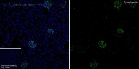 Immunofluorescence analysis of frozen mouse kidney tissue with Rat anti-Synaptopodin antibody (HA601402) at 1/500 dilution. The section was pre-treated using 1% SDS buffer (in PBS, pH 7.4) for 5 minutes at room temperature. The tissues were blocked in 10% negative goat serum for 1 hour at room temperature, washed with PBS, and then probed with the primary antibody (HA601402, green) at 1/500 dilution overnight at 4 ℃, washed with PBS. Goat Anti-Rat IgG H&L (iFluor™ 488, HA1133) was used as the secondary antibody at 1/1,000 dilution. Nuclei were counterstained with DAPI (blue).