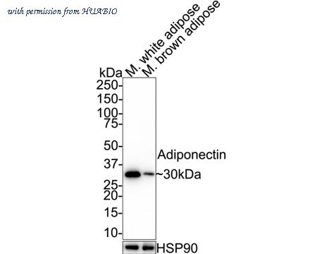 Western blot analysis of Adiponectin on different lysates with Rabbit anti-Adiponectin antibody (HA721064) at 1/2,000 dilution. Lane 1: Mouse white adipose lysate Lane 2: Mouse brown adipose tissue lysate Lysates/proteins at 20 µg/Lane. Predicted band size: 27 kDa Observed band size: 30 kDa Exposure time: 1 minute; ECL: K1801; 4-20% SDS-PAGE gel. Proteins were transferred to a PVDF membrane and blocked with 5% NFDM/TBST for 1 hour at room temperature. The primary antibody (HA721064) at 1/2,000 dilution was used in 5% NFDM/TBST at room temperature for 2 hours. Goat Anti-Rabbit IgG - HRP Secondary Antibody (HA1001) at 1/50,000 dilution was used for 1 hour at room temperature.