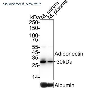Western blot analysis of Adiponectin on different lysates with Rabbit anti-Adiponectin antibody (HA721064) at 1/2,000 dilution. Lane 1: Mouse serum lysate Lane 2: Mouse plasma lysate Lysates/proteins at 40 µg/Lane. Predicted band size: 27 kDa Observed band size: 30 kDa Exposure time: 3 seconds; ECL: K1801; 4-20% SDS-PAGE gel. Proteins were transferred to a PVDF membrane and blocked with 5% NFDM/TBST for 1 hour at room temperature. The primary antibody (HA721064) at 1/2,000 dilution was used in primary antibody dilution (K1803) at 4℃ overnight. Goat Anti-Rabbit IgG - HRP Secondary Antibody (HA1001) at 1/50,000 dilution was used for 1 hour at room temperature.