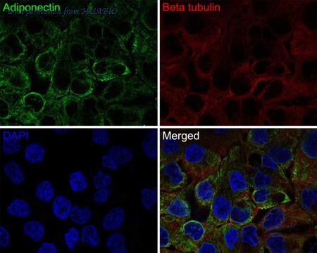Immunocytochemistry analysis of NCI-H441 cells labeling Adiponectin with Rabbit anti-Adiponectin antibody (HA721064) at 1/50 dilution. Cells were fixed in 4% paraformaldehyde for 10 minutes at 37 ℃, permeabilized with 0.05% Triton X-100 in PBS for 20 minutes, and then blocked with 2% negative goat serum for 30 minutes at room temperature. Cells were then incubated with Rabbit anti-Adiponectin antibody (HA721064) at 1/50 dilution in 2% negative goat serum overnight at 4 ℃. Goat Anti-Rabbit IgG H&L (Alexa Fluor® 488) was used as the secondary antibody at 1/1,000 dilution. Nuclear DNA was labelled in blue with DAPI. Beta tubulin (M1305-2, red) was stained at 1/200 dilution overnight at +4℃. Goat Anti-Mouse IgG H&L (iFluor™ 647, HA1127) were used as the secondary antibody at 1/1,000 dilution.
