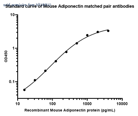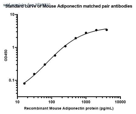Sandwich ELISA analysis of mouse Adiponectin matched pair antibodies Capture: HA723679, Mouse Adiponectin Rabbit mAb [PSH14-82] Detector: HA723680, Mouse Adiponectin Rabbit mAb [PSH14-83] Elisa assay was performed by coating wells of a 96-well plate with 100 µl per well of capture antibody (HA723679) diluted in carbonate/bicarbonate buffer, at a concentration of 2ug/ml overnight at 4℃. Wells of the plate were washed, blocked with 150 µl 0.05% tween-20 1% BSA blocking buffer, and incubated with serial diluted Recombinant Mouse Adiponectin protein (HA210973) starting from 4000 pg/ml to 0 pg/ml and detect antibody (HA723680, Biotin, 0.2 µg/ml) for 1 hour at 30℃ with shaking. Then the plate was washed and incubated with 100 µl per well of SA-HRP for 0.5 hour at 30℃ with shaking. Detection was performed using an Ultra TMB Substrate for 10 minutes at room temperature in the dark. The reaction was stopped with sulfuric acid and absorbances were read on a spectrophotometer at 450 nm.