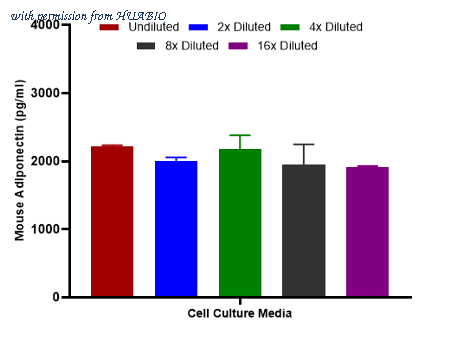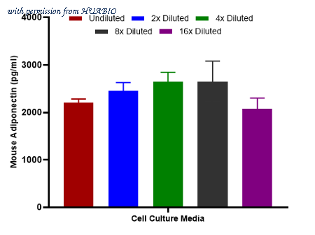 Interpolated concentrations of spiked Adiponectin in cell culture media samples. Capture: HA723679, Mouse Adiponectin Rabbit mAb [PSH14-82] Detector: HA723680, Mouse Adiponectin Rabbit mAb [PSH14-83] The concentrations of Adiponectin were measured in duplicates, interpolated from the Adiponectin standard curves and corrected for sample dilution. Undiluted samples are as follows: cell culture media 50%. The interpolated dilution factor corrected values are plotted (mean +/- SD, n=2).