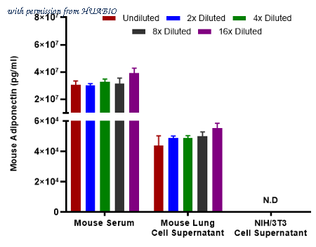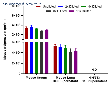 Interpolated concentrations of native Adiponectin in mouse samples. Capture: HA723682, Mouse Adiponectin Rabbit mAb [PSH14-84] Detector: HA723680, Mouse Adiponectin Rabbit mAb [PSH14-83] Interpolated concentration of native Adiponectin was measured in duplicate at different sample concentrations. The interpolated dilution factor corrected values were plotted (mean +/- SD, n=2). The mean Adiponectin concentration was determined to be 31 ug/mL in mouse serum and 47 ng/ml in mouse lung cell supernatant. There was no detectable signal in NIH/3T3 cell culture supernatant.