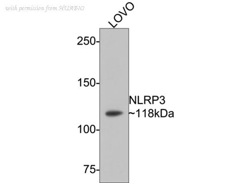 Western blot analysis of NLRP3 on LOVO cell lysates with Rabbit anti-NLRP3 antibody (ER1706-72) at 1/500 dilution. Lysates/proteins at 30 µg/Lane. Predicted band size: 118 kDa Observed band size: 118 kDa Exposure time: 1 minute; 6% SDS-PAGE gel. Proteins were transferred to a PVDF membrane and blocked with 5% NFDM/TBST for 1 hour at room temperature. The primary antibody (ER1706-72) at 1/500 dilution was used in 5% NFDM/TBST at room temperature for 2 hours. Goat Anti-Rabbit IgG - HRP Secondary Antibody (HA1001) at 1:300,000 dilution was used for 1 hour at room temperature.
