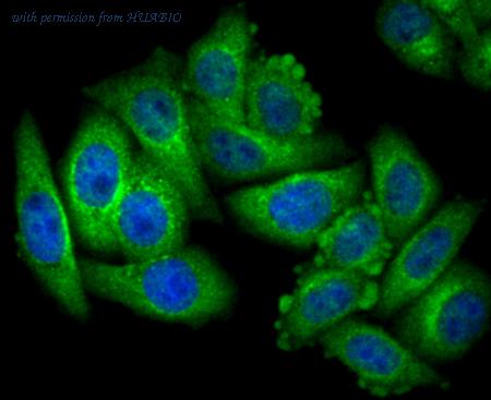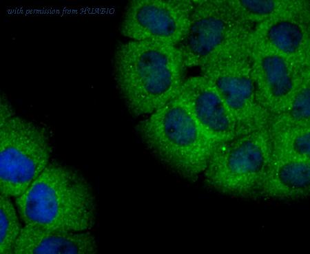 Immunocytochemistry analysis of HUVEC cells labeling NLRP3 with Rabbit anti-NLRP3 antibody (ET1610-93) at 1/50 dilution. Cells were fixed in 4% paraformaldehyde for 10 minutes at 37 ℃, permeabilized with 0.05% Triton X-100 in PBS for 20 minutes, and then blocked with 2% negative goat serum for 30 minutes at room temperature. Cells were then incubated with Rabbit anti-NLRP3 antibody (ET1610-93) at 1/50 dilution in 2% negative goat serum overnight at 4 ℃. Goat Anti-Rabbit IgG H&L (iFluor™ 488, HA1121) was used as the secondary antibody at 1/1,000 dilution. PBS instead of the primary antibody was used as the secondary antibody only control. Nuclear DNA was labelled in blue with DAPI.