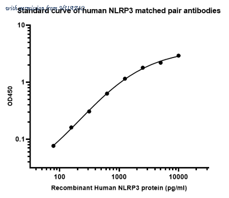 Sandwich ELISA analysis of human NLRP3 matched pair antibodies Elisa assay was performed by coating wells of a 96-well plate with 100 µl per well of capture antibody (HA723275) diluted in carbonate/bicarbonate buffer, at a concentration of 2ug/ml overnight at 4℃. Wells of the plate were washed, blocked with 150 µl 0.05% tween-20 1% BSA blocking buffer, and incubated with serial diluted Recombinant Human NLRP3 protein starting from 10000 pg/ml to 0 pg/ml and detect antibody (HA723278, Biotin, 0.2 µg/ml) for 1 hour at 30℃ with shaking. Then the plate was washed and incubated with 100 µl per well of SA-HRP for 0.5 hour at 30℃ with shaking. Detection was performed using an Ultra TMB Substrate for 10 minutes at room temperature in the dark. The reaction was stopped with sulfuric acid and absorbances were read on a spectrophotometer at 450 nm.
