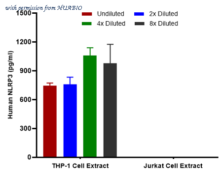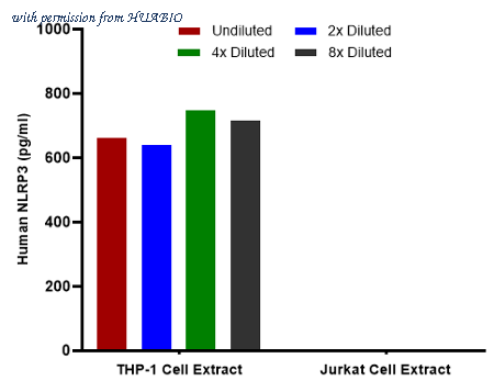 Interpolated concentrations of native NLRP3 in THP-1 and Jurkat extract samples based on a 1000 µg/ml extract load. Interpolated concentration of native NLRP3 was measured in duplicate at different sample concentrations and interpolated from the NLRP3 standard curves. The mean NLRP3 concentration was determined to be 691 pg/mL in THP-1 cell extract. There was no detectable signal in Jurkat cell extract.