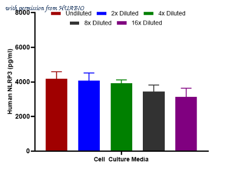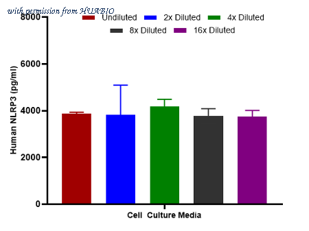 Interpolated concentrations of spiked NLRP3 in cell culture media samples. The concentrations of NLRP3 were measured in duplicates, interpolated from the NLRP3 standard curves and corrected for sample dilution. Undiluted samples are as follows: cell culture media 50%. The interpolated dilution factor corrected values are plotted (mean +/- SD, n=2).