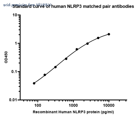 Sandwich ELISA analysis of human NLRP3 matched pair antibodies Elisa assay was performed by coating wells of a 96-well plate with 100 µl per well of capture antibody (HA723275) diluted in carbonate/bicarbonate buffer, at a concentration of 2ug/ml overnight at 4℃. Wells of the plate were washed, blocked with 150 µl 0.05% tween-20 1% BSA blocking buffer, and incubated with serial diluted Recombinant Human NLRP3 protein starting from 10000 pg/ml to 0 pg/ml and detect antibody (HA723276, Biotin, 0.2 µg/ml) for 1 hour at 30℃ with shaking. Then the plate was washed and incubated with 100 µl per well of SA-HRP for 0.5 hour at 30℃ with shaking. Detection was performed using an Ultra TMB Substrate for 10 minutes at room temperature in the dark. The reaction was stopped with sulfuric acid and absorbances were read on a spectrophotometer at 450 nm.