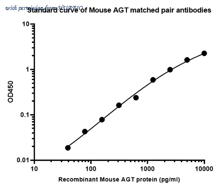 Sandwich ELISA analysis of Mouse Angiotensinogen/AGT matched pair antibodies Capture: HA725131, Mouse Angiotensinogen/AGT Rabbit mAb [PSH17-09] Detector: HA725132, Mouse Angiotensinogen/AGT Rabbit mAb [PSH17-10] Elisa assay was performed by coating wells of a 96-well plate with 50 µl per well of capture antibody (HA725131) diluted in carbonate/bicarbonate buffer, at a concentration of 2 µg/ml overnight at 4℃. Wells of the plate were washed, blocked with 150 µl 0.05% tween-20 1% BSA blocking buffer, and incubated with serial diluted Recombinant Mouse Angiotensinogen/AGT protein (HA211120) starting from 20,000 pg/ml to 0 pg/ml and detect antibody (HA725132, Biotin, 0.05 µg/ml) for 1 hour at 30℃ with shaking. Then the plate was washed and incubated with 50 µl per well of SA-HRP for 0.5 hour at 30℃ with shaking. Detection was performed using an Ultra TMB Substrate for 10 minutes at room temperature in the dark. The reaction was stopped with sulfuric acid and absorbances were read on a spectrophotometer at 450 nm.