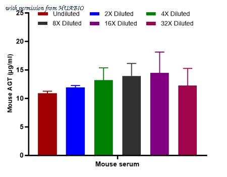 Interpolated concentrations of native AGT in mouse serum samples. Capture: HA725131, Mouse Angiotensinogen/AGT Rabbit mAb [PSH17-09] Detector: HA725132, Mouse Angiotensinogen/AGT Rabbit mAb [PSH17-10] The concentrations of AGT were measured in duplicates, interpolated from the AGT standard curve and corrected for sample dilution. Undiluted samples are as follows: mouse serum 1:100. The interpolated dilution factor corrected values are plotted (mean +/- SD, n=2). The mean serum concentration was determined to be 12.78 µg/ml in mouse serum.