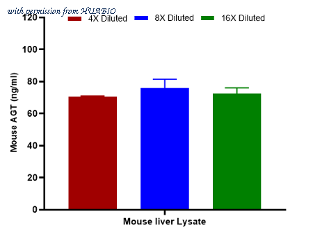 Interpolated concentrations of native AGT in mouse liver lysate samples. Capture: HA725131, Mouse Angiotensinogen/AGT Rabbit mAb [PSH17-09] Detector: HA725132, Mouse Angiotensinogen/AGT Rabbit mAb [PSH17-10] The concentrations of AGT were measured in duplicates, interpolated from the AGT standard curve and corrected for sample dilution. Undiluted samples are as follows: mouse liver supernatant 0.2mg/ml. The interpolated dilution factor corrected values are plotted (mean +/- SD, n=2). The mean serum concentration was determined to be 72.92 ng/ml in mouse liver lysate.