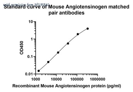 Sandwich ELISA analysis of Mouse Angiotensinogen/AGT matched pair antibodies Capture: HA725131, Mouse Angiotensinogen/AGT Rabbit mAb [PSH17-09] Detector: HA725132, Mouse Angiotensinogen/AGT Rabbit mAb [PSH17-10] Elisa assay was performed by coating wells of a 96-well plate with 50 µl per well of capture antibody (HA725131) diluted in carbonate/bicarbonate buffer, at a concentration of 2 µg/ml overnight at 4℃. Wells of the plate were washed, blocked with 150 µl 0.05% tween-20 1% BSA blocking buffer, and incubated with serial diluted Recombinant Mouse Angiotensinogen/AGT protein (HA211120) starting from 333,000 pg/ml to 0 pg/ml and detect antibody (HA725132, HRP, 0.5 µg/ml) for 1 hour at 30℃ with shaking. Detection was performed using an Ultra TMB Substrate for 10 minutes at room temperature in the dark. The reaction was stopped with sulfuric acid and absorbances were read on a spectrophotometer at 450 nm.