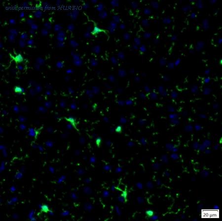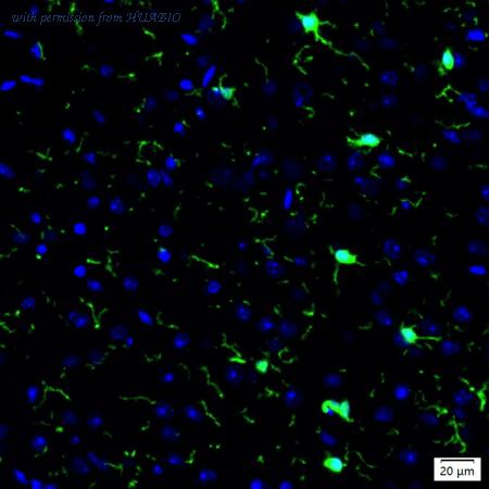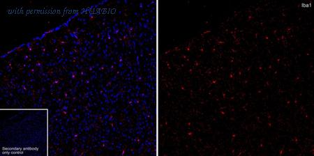 Application: IHC-Fr Species: Mouse Site: Cerebral cortex Sample: Frozen section Antibody concentration: 1/500 (Iba1, HA601368, red); 1/500 (NeuN, HA601111, green) Antigen retrieval: Not required