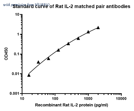 Sandwich ELISA analysis of rat IL-2 matched pair antibodies Elisa assay was performed by coating wells of a 96-well plate with 50 µl per well of capture antibody (HA722423) diluted in carbonate/bicarbonate buffer, at a concentration of 2 µg/mL overnight at 4℃. Wells of the plate were washed, blocked with 150 µl 0.05% tween-20 1% BSA blocking buffer, and incubated with serial diluted recombinant standard Rat IL-2 protein (HA210683) starting from 2,000 pg/ml to 0 pg/ml and detect antibody (HA722423, Biotin, 0.2 µg/ml) for 1 hour at 30℃ with shaking. Then the plate was washed and incubated with 50 µl per well of SA-HRP for 0.5 hour at 30℃ with shaking. Detection was performed using an Ultra TMB Substrate for 10 minutes at room temperature in the dark. The reaction was stopped with sulfuric acid and absorbances were read on a spectrophotometer at 450 nm.