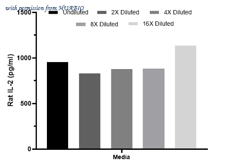 Interpolated concentrations of spiked IL-2 in rat cell culture media samples. The concentrations of IL-2 were interpolated from the IL-2 standard curves and corrected for sample dilution. Undiluted samples are as follows: cell culture media 50%.