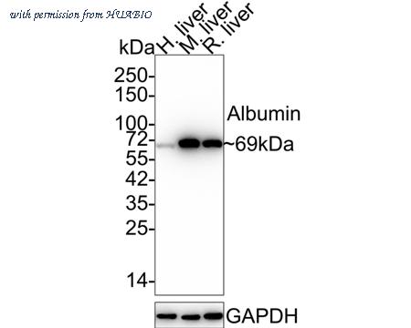 Western blot analysis of Albumin on different lysates with Rabbit anti-Albumin antibody (HA750352) at 1/5,000 dilution. Lane 1: Human liver tissue lysate Lane 2: Mouse liver tissue lysate Lane 3: Rat liver tissue lysate Lysates/proteins at 20 µg/Lane. Predicted band size: 69 kDa Observed band size: 69 kDa Exposure time: 30 seconds; 4-20% SDS-PAGE gel. Proteins were transferred to a PVDF membrane and blocked with 5% NFDM/TBST for 1 hour at room temperature. The primary antibody (HA750352) at 1/5,000 dilution was used in 5% NFDM/TBST at 4℃ overnight. Goat Anti-Rabbit IgG - HRP Secondary Antibody (HA1001) at 1:50,000 dilution was used for 1 hour at room temperature.