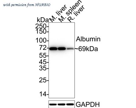Western blot analysis of Albumin on different lysates with Rabbit anti-Albumin antibody (HA750352) at 1/40,000 dilution. Lane 1: Mouse liver tissue lysate Lane 2: Mouse spleen tissue lysate Lane 3: Rat liver tissue lysate Lysates/proteins at 20 µg/Lane. Predicted band size: 69 kDa Observed band size: 69 kDa Exposure time: 10 seconds; ECL: K1801; 4-20% SDS-PAGE gel. Proteins were transferred to a PVDF membrane and blocked with 5% NFDM/TBST for 1 hour at room temperature. The primary antibody (HA750352) at 1/40,000 dilution was used in 5% NFDM/TBST at 4℃ overnight. Goat Anti-Rabbit IgG - HRP Secondary Antibody (HA1001) at 1/50,000 dilution was used for 1 hour at room temperature.