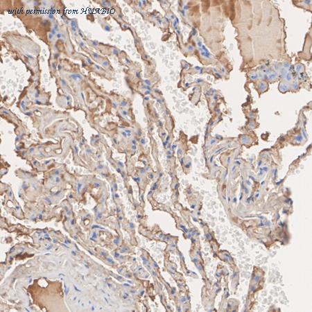 Immunohistochemical analysis of paraffin-embedded human lung tissue with Rabbit anti-Albumin antibody (HA750352) at 1/30,000 dilution. The section was pre-treated using heat mediated antigen retrieval with Tris-EDTA buffer (pH 9.0) for 20 minutes. The tissues were blocked in 1% BSA for 20 minutes at room temperature, washed with ddH2O and PBS, and then probed with the primary antibody (HA750352) at 1/30,000 dilution for 1 hour at room temperature. The detection was performed using an HRP conjugated compact polymer system. DAB was used as the chromogen. Tissues were counterstained with hematoxylin and mounted with DPX.
