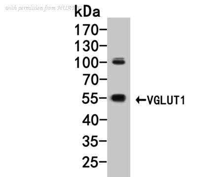 Western blot analysis of VGLUT1 on rat brain tissue lysate. Proteins were transferred to a PVDF membrane and blocked with 5% BSA in PBS for 1 hour at room temperature. The primary antibody (HA500083, 1/200,000) was used in 5% BSA at room temperature for 2 hours. Goat Anti-Rabbit IgG - HRP Secondary Antibody (HA1001) at 1:5,000 dilution was used for 1 hour at room temperature.