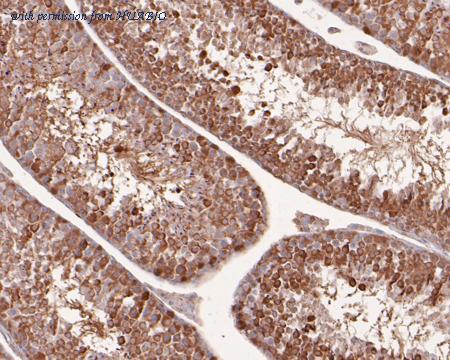 Immunohistochemical analysis of paraffin-embedded mouse testis tissue using anti-VGLUT1 antibody. The section was pre-treated using heat mediated antigen retrieval with Tris-EDTA buffer (pH 8.0-8.4) for 20 minutes.The tissues were blocked in 5% BSA for 30 minutes at room temperature, washed with ddH2O and PBS, and then probed with the primary antibody (HA500083, 1/400) for 30 minutes at room temperature. The detection was performed using an HRP conjugated compact polymer system. DAB was used as the chromogen. Tissues were counterstained with hematoxylin and mounted with DPX.