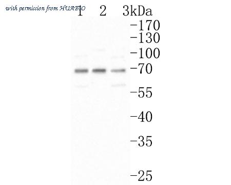 Western blot analysis of VGluT1 on different lysates. Proteins were transferred to a PVDF membrane and blocked with 5% NFDM/TBST for 1 hour at room temperature. The primary antibody (HA500488, 1/1,000) was used in 5% NFDM/TBST at room temperature for 2 hours. Goat Anti-Rabbit IgG - HRP Secondary Antibody (HA1001) at 1:200,000 dilution was used for 1 hour at room temperature. Positive control: Lane 1: Mouse brain tissue lysate Lane 2: Rat brain tissue lysate Lane 3: Mouse cerebellum tissue lysate