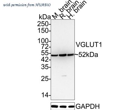 Western blot analysis of VGLUT1 on different lysates with Mouse anti-VGLUT1 antibody (HA601014) at 1/1,000 dilution. Lane 1: Mouse brain tissue lysate Lane 2: Rat brain tissue lysate Lane 3: Human brain tissue lysate Lysates/proteins at 20 µg/Lane. Predicted band size: 62 kDa Observed band size: 52 kDa Exposure time: 1 minute 59 seconds; ECL: K1801; 4-20% SDS-PAGE gel. Proteins were transferred to a PVDF membrane and blocked with 5% NFDM/TBST for 1 hour at room temperature. The primary antibody (HA601014) at 1/1,000 dilution was used in 5% NFDM/TBST at 4℃ overnight. Goat Anti-Mouse IgG - HRP Secondary Antibody (HA1006) at 1/50,000 dilution was used for 1 hour at room temperature.