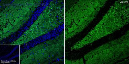 Application: IHC-Fr Species: Mouse Site: hippocampus Sample: Frozen section Antibody concentration: 1/500 (VGLUT1, HA601449, Guinea pig, red); 1/500 (VGLUT2, HA601451, Mouse, green) Antigen retrieval: Not required
