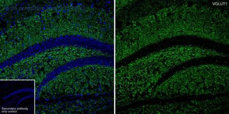 Application: IHC-Fr Species: Mouse Site: Hippocampus Sample: Frozen section Antibody concentration: 1/500 (VGLUT1, HA601392, green); 1/500 (VGluT2, HA723218, red) Antigen retrieval: Not required